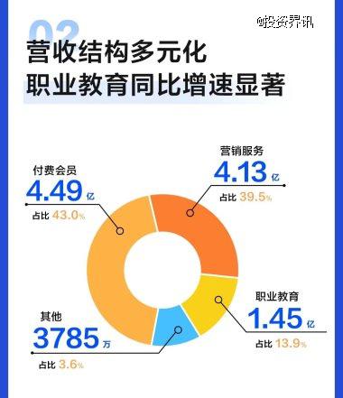第二季度,知乎業務繼續保持健康發展," 社區 + 教育 " 的雙增長曲線持續穩固。其中付費會員收入達到 4.49 億元,同比增長 65.6%,實現 43% 的收入占比,貢獻值位列第一。知乎營銷服務收入約為 4.13 億元。職業教育業務延續迅猛增長態勢,收入 1.45 億元實現超兩倍增長。