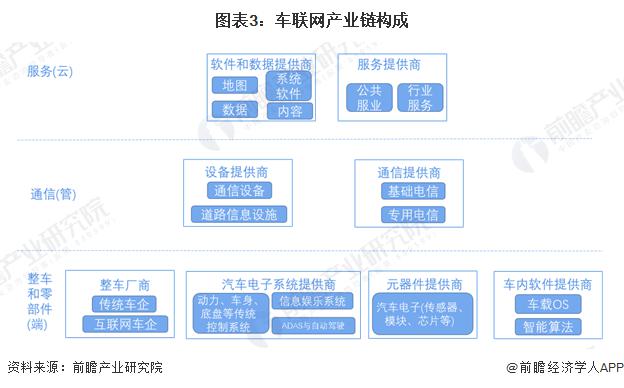 由于車聯網產業跨界滲透融合性強,其產業鏈構成也區別于傳統的上、中、下游的產業鏈構成方式,可以結合車聯網系統結構進行分析。車聯網的系統結構包括 " 端、管、云 " 三個系統,車聯網產業鏈可以從這三個系統維度進行劃分。