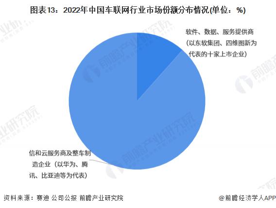 從市場份額來看,當前軟件、數據、服務提供商市場份額小,其中 2022 年 10 家代表企業市占率僅 10% 左右。通信和云服務商及整車制造龍頭企業規模優勢大、布局領域廣泛,在市場中占據了主導地位,擁有較高的市占率,其中以華為、騰訊、比亞迪等企業為代表。