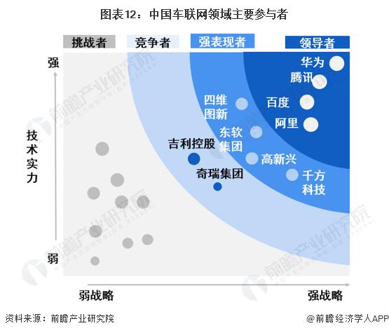 從中國車聯網行業競爭梯隊來看,我國強戰略強技術實力的領導者企業包括阿里、華為、騰訊和百度等企業 ; 強表現者包括四維圖新、東軟集團、高新興和千方科技等企業 ; 競爭者包括吉利控股及奇瑞集團等傳統及互聯網汽車制造廠商。