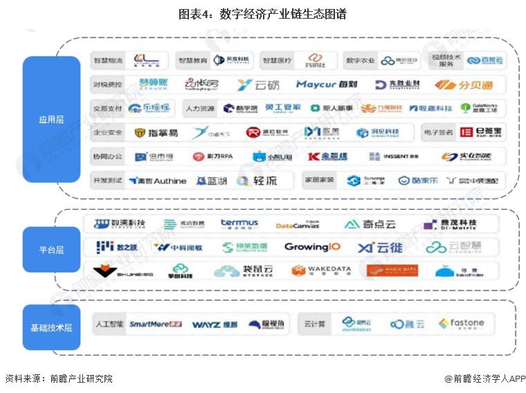 數字經濟產業鏈主要包括三大環節,即基礎技術層、平臺層以及應用層。基礎技術層為構建數字經濟體系所需要用到的各項新一代互聯網信息技術,包括大數據、人工智能、區塊鏈、物聯網、云計算、量子計算等,平臺層是將技術進行集成化運用,實現特定功能轉換的平臺,包括大數據管理及分析平臺、大數據平臺及中臺兩大平臺。應用層覆蓋范圍較廣泛,基本覆蓋到居民生活、工作的方方面面。數字經濟從單一的業態或功能為切入點,將各環節進行數字化升級,形成智慧產業,不同產業、業態進行集成后,最終形成智慧城市、智慧園區、智慧社區、智慧生活等宏觀的終端解決方案。