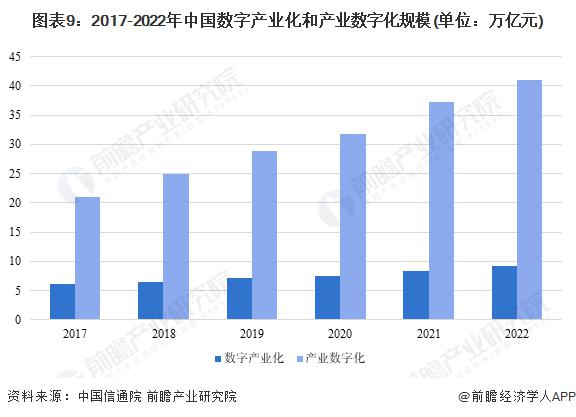 總體來看,2017 年至 2022 年,我國產業數字化占數字經濟比重在 80% 左右波動,數字產業化占比在 20% 左右波動。2022 年,我國數字產業化規模約為 9.2 萬億元,產業數字化規模約為 41.0 萬億元。數字產業化向著強基礎、重創新、筑優勢方向轉變,同時,互聯網、大數據、人工智能等技術在促進產業數字化進程方面發揮著重要作用。