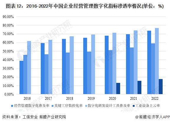 從數字化工具賦能企業數字化轉型方面來看,根據 2016 年至 2022 年四大指標 ( 經營管理數字化普及率、關鍵工序數控化率、數字化研發設計工具普及率、工業設備上云率 ) 的變化情況,可以看出,我國企業數字化治理水平持續提升,數字化滲透率持續增長,2020 年開始,工業設備上云逐漸普及,到 2022 年,已達到 17.7% 的滲透率。