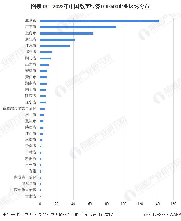 根據中國企業評價協會和中國信息通信研究院在京發布的《2022 中國數字經濟企業發展報告》及 " 數字經濟企業 TOP500 發展指數 ",我國 TOP500 數字經濟企業分布地區中,北京市數量最多,達到了 143 家,其次為廣東省,為 91 家。滬、浙、江其次,數量分別為 64 家、42 家、36 家。總體來看,北京市、珠三角、長三角是數字經濟 TOP500 企業分布的重點地區。