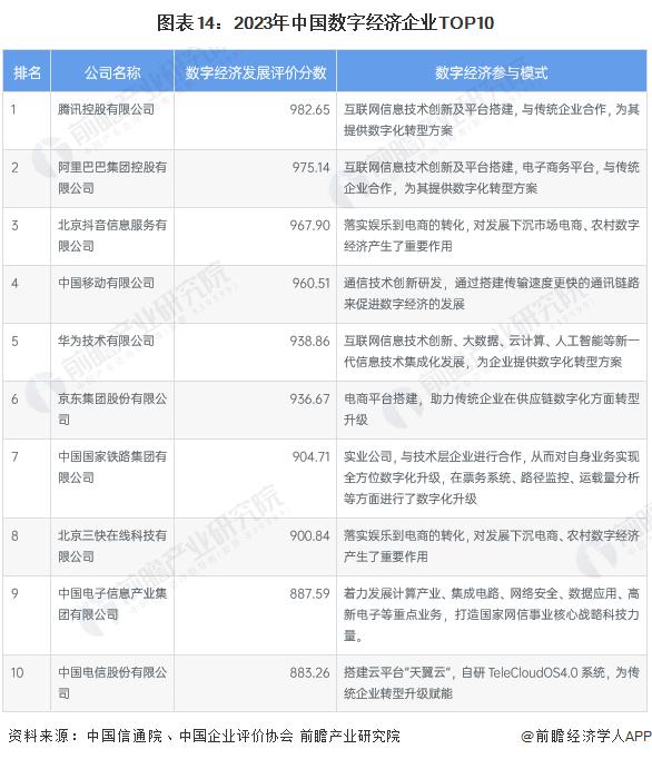 2023 年 11 月,中國企業評價協會和中國信息通信研究院在京發布了《2022 中國數字經濟企業發展報告》及 2023 數字經濟企業 TOP500 榜單,其中,榜單前十分別為騰訊、阿里、抖音、中國移動、華為、京東、國家鐵路集團、快手、中國電子、中國電信。具體情況如下圖所示: