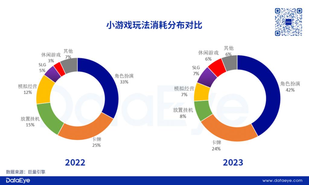 另外在產品維度上,巨量引擎數據顯示,隨著各大頭部小游戲開發者入局抖音小游戲,游戲產品從輕度休閑向中重度品類發展。典型的如 RPG 品類,消耗占比從 2022 年的 33%,增長到 2023 年的 42%。