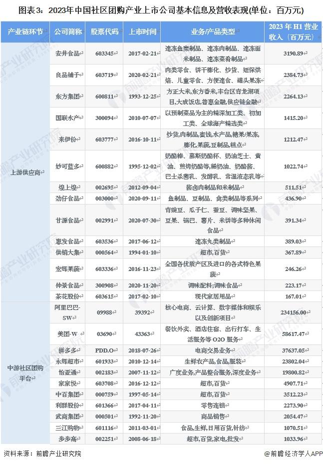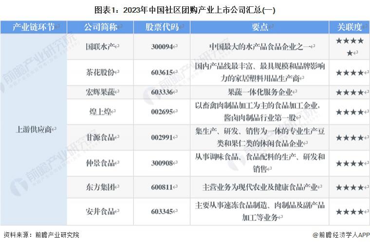 社區團購產業的上市企業分布在上游供應商和中游社區團購平臺。上游主要有國聯水產 ( 300094 ) 、茶花股份 ( 603615 ) 、宏輝果蔬 ( 603336 ) 、煌上煌 ( 002695 ) 等企業 ; 中游主要有拼多多 ( PDD.O ) 、美團 -W ( 03690 ) 、阿里巴巴 -SW ( 688327 ) 等企業。具體上市公司信息如下: