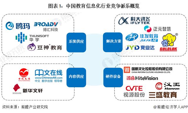 教育信息化行業(yè)中根據(jù)企業(yè)聚焦的環(huán)節(jié)以及企業(yè)技術(shù)實(shí)力較為強(qiáng)勁的領(lǐng)域進(jìn)行劃分,可以將教育信息化行業(yè)的廠商劃分為系統(tǒng)供應(yīng)廠商、解決方案廠商、內(nèi)容供應(yīng)廠商以及硬件設(shè)備廠商。行業(yè)各派系中競(jìng)爭(zhēng)者眾多,其中,以解決方案廠商為主的部分教育信息化代表性企業(yè)已完成了對(duì)教育信息化產(chǎn)業(yè)鏈多環(huán)節(jié)的布局。