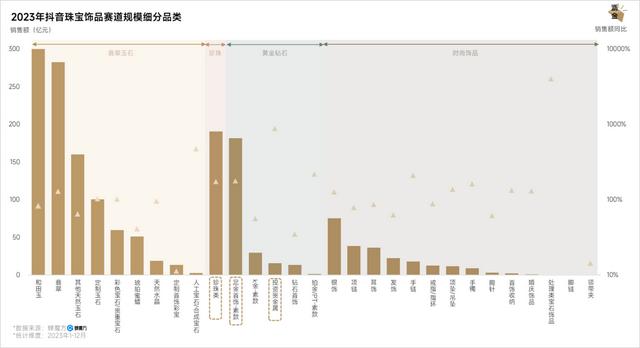 6、高價低頻的翡翠玉石、黃金鉆石在抖音實現全品類增長。抖音珠寶極大可能成為該平臺的強勢賽道。