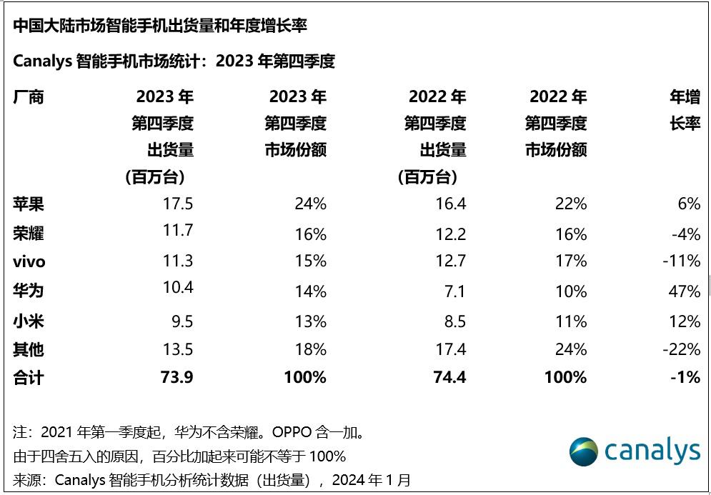 2023 年第四季度,中國大陸手機市場跌幅進一步收窄,整體出貨 7390 萬臺,同比下跌 1%。其中,蘋果四季度出貨 1750 萬臺,位居榜首。蘋果新產品供應充足,出貨同比增長 6%。榮耀以 16% 的市場份額緊隨其后,位居第二,出貨 1170 萬臺。vivo 出貨 1130 萬臺,排名上升至第三。華為出貨 1040 萬臺,通過旗艦新品出貨同比上升 47%,回歸前五榜單,排名第四。小米數字系列新品在四季度取得亮眼表現,以 950 萬臺出貨保持排名第五。2023 年中國智能手機出貨量同比下降 5% 至 2.73 億部。蘋果首次奪得中國大陸市場全年出貨第一位置,同比出貨微增 1%。全年市場份額進一步提升至 19%。vivo,OPPO 和榮耀勢均力敵,企穩在 16% 的市場份額,全年分別出貨 4450 萬臺,4390 萬臺,4360 萬臺。小米以 13% 維持在全年市場第五。位于第六名的華為全年份額從 2022 年的 8% 躍升至 12%,出貨同比增長 48%。