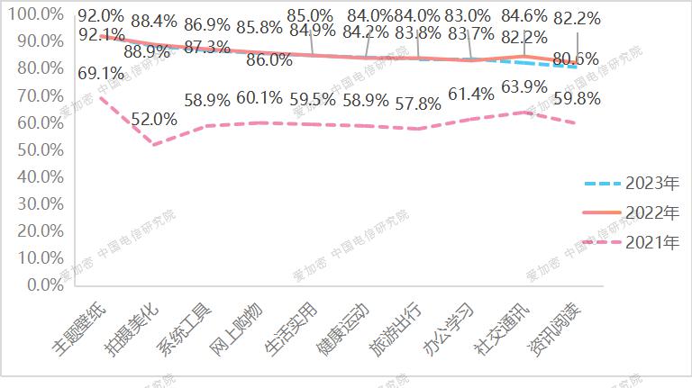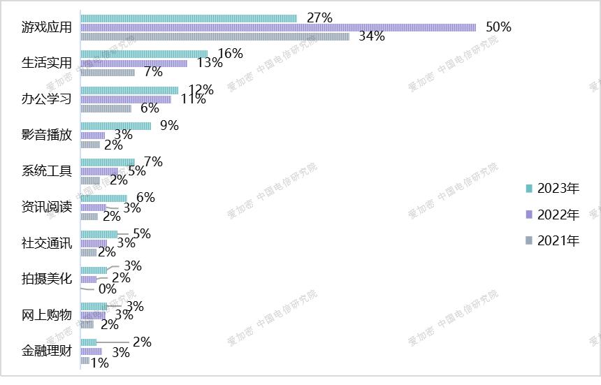 截至到 2023 年 12 月 31 日,全國活躍應(yīng)用總計(jì) 7 萬款。從功能類型來看,游戲類應(yīng)用活躍度較高,占全國活躍應(yīng)用總量的 27%,位居第一,近三年對(duì)比,游戲應(yīng)用遠(yuǎn)低于以往兩年;生活實(shí)用類應(yīng)用數(shù)量占全國活躍應(yīng)用的 16%,位居第二;辦公學(xué)習(xí)類應(yīng)用數(shù)量占全國活躍應(yīng)用的 12%,位居第三。