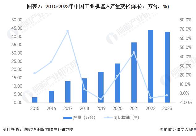 根據國家統計局數據,2017 年,我國工業機器人的產量突破 10 萬臺,2020 年突破 20 萬臺。2022 年,我國工業機器人迎來國內市場與國際市場的雙重利好,產量超過 44 萬臺。2023 年有小幅下滑,但仍然保持在 40 萬臺以上。