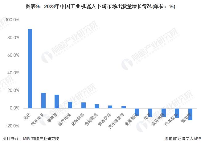 從應用市場來看,工業機器人的消費市場范圍較廣,2023 年,光伏、汽車電子、半導體等新興行業消費需求拉動效果明顯 ; 而鋰電、汽車整車等市場需求出現不同程度的下降。