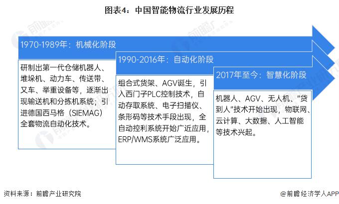 中國物流行業發展共經歷了三個階段,分別是機械化階段、自動化階段和智慧化階段。在機械化階段,物流機械設備被相繼發明出來并投入物流活動當中,但計算機還很少應用到物流管理中來,全自動控制的系統寥寥無幾,自動化立體庫在有限的幾個領域得到應用 ; 在自動化階段,自動化立體庫逐步展開應用,AGV 技術和一系列管理系統誕生 ; 在智慧化階段,以工業 4.0 為契機的生產物流系統大規模應用,機器人、無人機、" 貨到人 " 等技術相繼涌現,各項傳統科技與新興科技開始整合。在這個階段,互聯網、大數據、云計算、人工智能等現代信息技術成為主流。