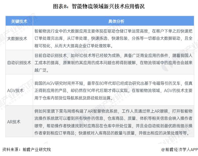 大數據、物聯網、云計算、智能機器人等新技術及裝備作為智能物流發展的根基,越來越廣泛地被應用于物流行業,在整個智能物流體系框架中起到關鍵的支撐作用。新一代信息技術在近幾年來發展迅速,正在與物流行業深度融合發展。部分新興技術在智能物流領域中的應用情況如下:
