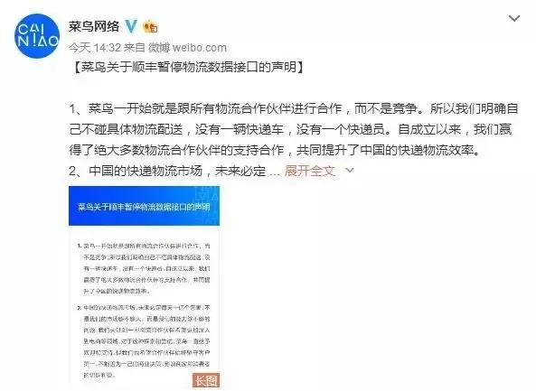 當(dāng)時(shí)菜鳥(niǎo)要求所有快遞柜信息的觸發(fā)必須通過(guò)菜鳥(niǎo)裹裹,取件碼信息無(wú)條件給到菜鳥(niǎo),豐巢需要返回所有包裹信息給菜鳥(niǎo)(包括非淘系訂單),隨即通過(guò)一紙聲明,封殺了順豐的物流數(shù)據(jù)接口。