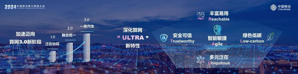 中國移動董事長楊杰在大會主論壇發表《算力網絡點亮 AI 新時代》的主旨演講,報告中提出了中國移動將推動算力網絡加速邁向算網 3.0 新階段,深化 " 多元泛在(Ubiquitous)、智能敏捷(Agile)、豐富易用(Reachable)、安全可信(Trustworthy)、綠色低碳(Low-carbon)" 的算網 "ULTRA" 新特性,加快實現算力網絡規模部署和廣泛應用。