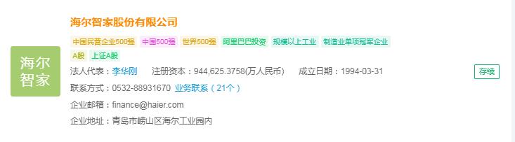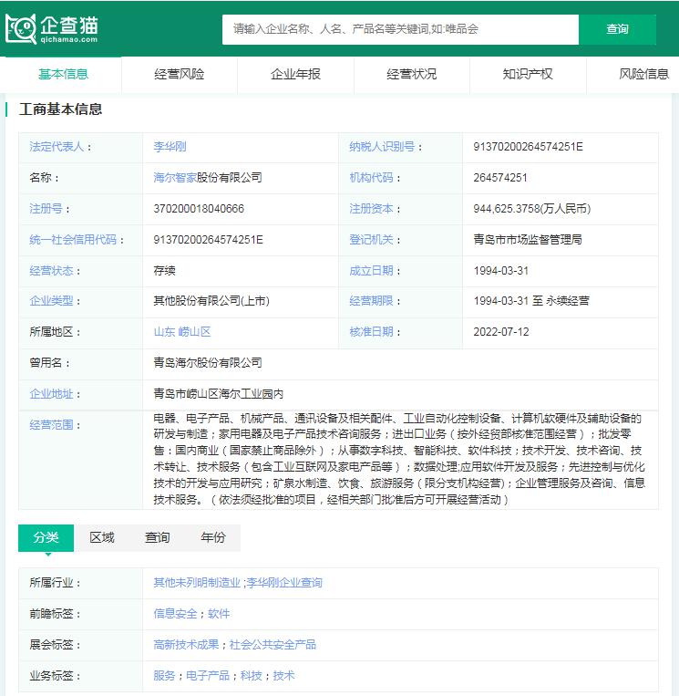 企查貓資料顯示,海爾智家股份有限公司成立于 1994 年,是海爾集團公司旗下的一家上市公司,也是中國民營企業 500 強之一。該公司注冊資金達 944,625.3758 萬人民幣