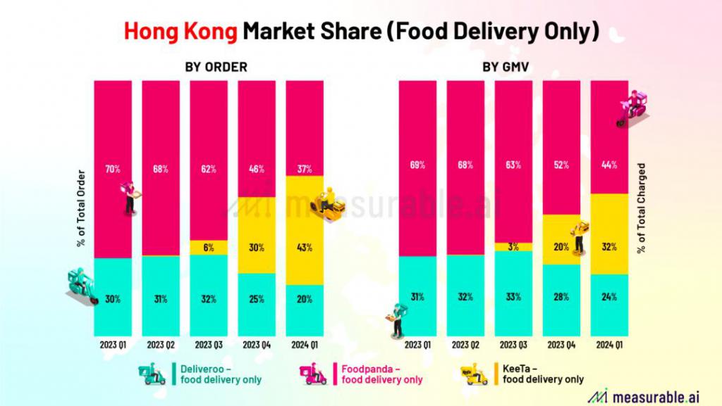 一個月前,市場調(diào)研公司 Measurable AI 發(fā)布數(shù)據(jù),美團在香港公司 KeeTa 以 43% 的送單量份額名列榜首;按 GMV 計算美團也成功超越 Deliveroo。這一切距離美團正式入駐香港,也僅僅過去了一年。