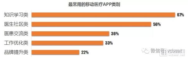 在醫生最常用的醫療APP中,67%與56%的醫生分別選擇了知識學習類與醫生社區類,這意味著移動醫療工具了類APP盡管承載了目前醫生最迫切的需求,但醫生最常用的APP依舊是知識提升類和社交類APP。