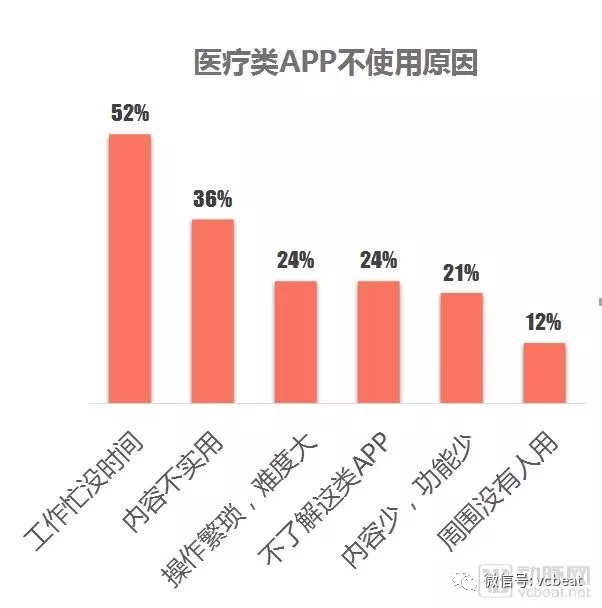 “工作忙,沒時間”是醫生不使用移動醫療APP的主要原因,超過52%的用戶都選擇了該選項。這樣的問題恰恰為工具類醫療APP帶來了機會。