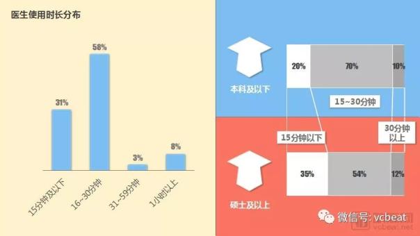 3、在醫療業務的協作中,主要由低年資醫生進行操作,而這類醫生往往是本科及以下學歷,其工作實施過程更容易產生移動醫療APP的需求點,促使使用時長的增加。