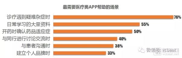 在問詢“您最希望在什么時候得到醫療APP幫助時”,超過76%的患者表示是在診療過程中遇到疑難雜癥時最需要幫助;類似的,“開藥時確認藥品適應癥”是第三大需求場景,有50%的醫生選擇了該選項。這兩類需求屬于具體的醫療服務場景,而之前最受醫生喜歡的知識提升需求,僅排第二。