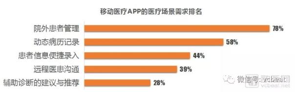 在醫療服務場景的需求排名中,有超過一半的醫生選擇了“院外患者管理”與“動態病歷記錄”兩個選項,這兩類需求場景不容忽視,實際上這樣的結果也體現出現階段醫生最具體的APP產品功能需求。