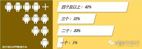 在APP的使用數量上面,“四個及以上”的用戶最多。但值得注意的是,58%用戶的移動醫療APP不超過3個,相對于醫生用戶多元的使用需求而言,3個APP明顯偏少。