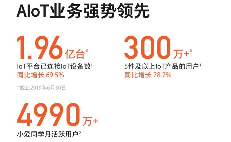 不過截止 2019 年 6 月 30 日,小米 IoT 平臺已連接的 IoT 設備數(不包括智能手機及筆記本計算機)達 1.96 億臺,同比增長 69.5%。巨量的 IoT 設備有助于小米對市場進行教育,而不那么高的產品單價,也能降低消費者接受教育的門檻。