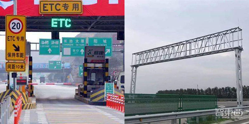 ▲左圖為收費(fèi)站式的 ETC 門架,右圖為 " 龍門架 " 式自由流 ETC 門架