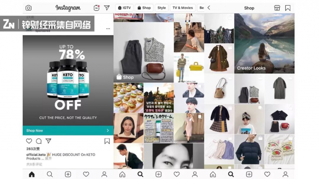 從用戶的視角去看,ins 當前在做的可變現行為,一個是關注頁里插入商家投放廣告,另一個是信息流推薦頁面中可以外鏈電商平臺的 shop 欄。