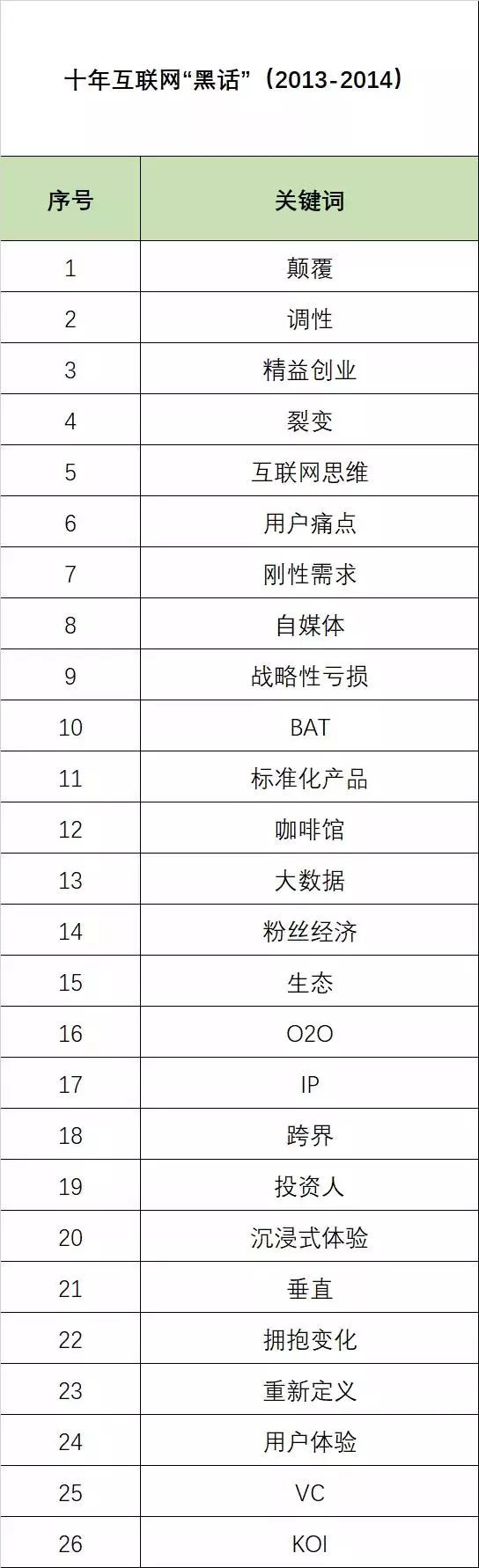 顛覆、調(diào)性、精益創(chuàng)業(yè)、裂變、互聯(lián)網(wǎng)思維、用戶痛點(diǎn)、剛性需求、自媒體、戰(zhàn)略性虧損、BAT、標(biāo)準(zhǔn)化產(chǎn)品、咖啡館、大數(shù)據(jù)、粉絲經(jīng)濟(jì)、生態(tài)、O2O、IP、跨界、投資人、沉浸式體驗(yàn)、垂直、擁抱變化、重新定義、用戶體驗(yàn)、VC、KOl。