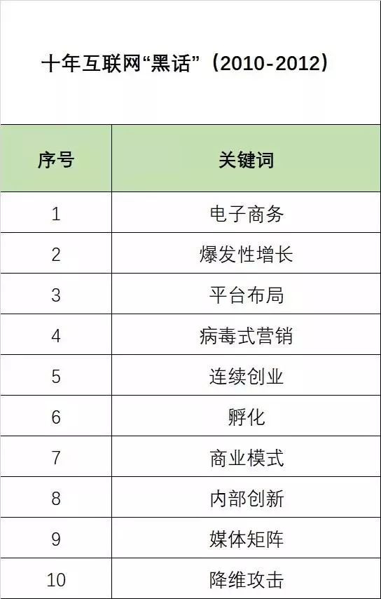 從對(duì)最近 10 年互聯(lián)網(wǎng) " 黑話 " 的梳理來(lái)看,2010 年到 2012 年的三年中,出現(xiàn)了 10 個(gè)傳播較為廣泛的關(guān)鍵詞,分別是電子商務(wù)、爆發(fā)性增長(zhǎng)、平臺(tái)布局、病毒式營(yíng)銷、連續(xù)創(chuàng)業(yè)、孵化、商業(yè)模式、內(nèi)部創(chuàng)新、媒體矩陣、降維攻擊。