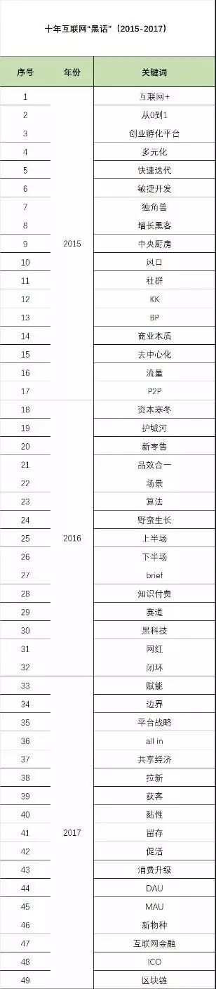 2017 年:賦能、邊界、平臺(tái)戰(zhàn)略、all in、共享經(jīng)濟(jì)、拉新、獲客、黏性、留存、促活、消費(fèi)升級(jí)、DAU、MAU、新物種、互聯(lián)網(wǎng)金融、ICO、區(qū)塊鏈。