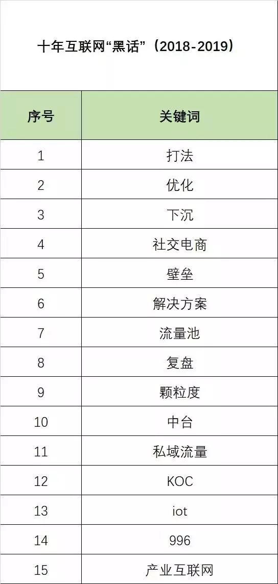 這些新增的黑話分別是:打法、優(yōu)化、下沉、社交電商、壁壘、解決方案、流量池、復(fù)盤、顆粒度、中臺(tái)、私域流量、KOC、iot、996、產(chǎn)業(yè)互聯(lián)網(wǎng)。