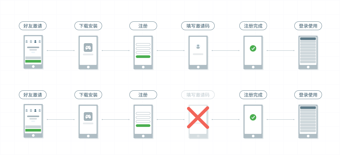 填寫邀請碼的原理很簡單,為邀請者生成一個專屬的邀請碼給新用戶填寫即可。填寫邀請碼環(huán)節(jié)的出現(xiàn),本質(zhì)上僅僅是滿足開發(fā)者和推廣人員的統(tǒng)計需求,然而卻讓用戶安裝的環(huán)節(jié)多了一個步驟,影響用戶的安裝體驗,相信大家都知道App推廣環(huán)節(jié)每增加一步,用戶流失的可能性都會隨之增加了,而且一旦新用戶對填寫邀請碼環(huán)節(jié)的繁瑣產(chǎn)生了反感,選擇放棄注冊或者跳過填寫邀請碼,那么邀請活動都會以失敗告終。