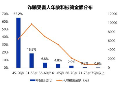 PingWest 品玩 10 月 9 日訊,騰訊 110 平臺(tái)今日發(fā)布《中老年人反欺詐白皮書》(以下簡(jiǎn)稱 " 白皮書 ")。從詐騙受害人群來看,45-50 歲的 70 后群體受騙占比超過 65%;60 后群體往往有閑置資金,更容易落入虛假投資等騙局,人均被騙金額最大。