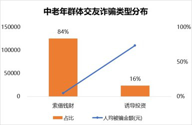 詐騙團(tuán)伙利用中老年人熱愛交友的特點(diǎn),在日常聊天中建立友好關(guān)系,再以突發(fā)情況為由借錢、推薦虛假理財(cái)產(chǎn)品等方式實(shí)施詐騙,是交友詐騙的慣用套路。白皮書數(shù)據(jù)顯示,索借錢財(cái)類詐騙占比高達(dá) 84%;而獲取信任后誘導(dǎo)投資,中老年群體人均受騙金額在萬元以上,最高被騙金額超過 10 萬元。