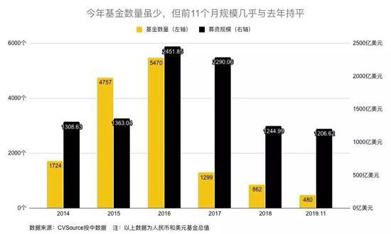 投資機構迎來倒閉潮。CVSource 投中數據顯示,2014 年共有 1724 支基金,2015 年,這一數據翻了 2.7 倍,有 4757 支基金,但截至 2019 年 11 月,僅剩下 480 支基金。