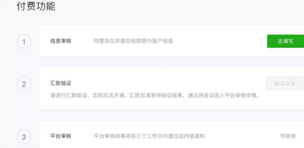 公眾號創作者開通付費功能需要經歷三個步驟,信息審核、匯款驗證和平臺審核。