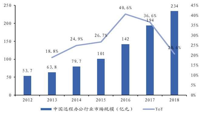 ▼ 我國(guó)遠(yuǎn)程辦公市場(chǎng)過去幾年增速維持 20% 以上增長(zhǎng)