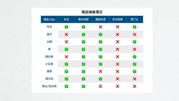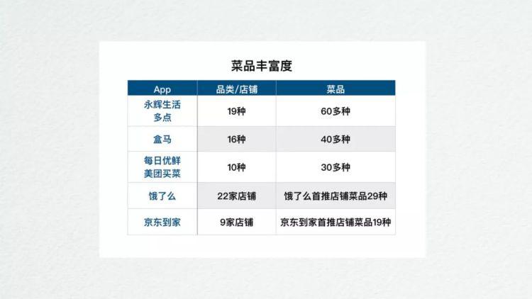 點評:最豐富的是永輝、多點,其次是盒馬、每日優(yōu)鮮、美團(tuán)買菜。