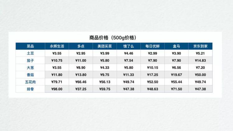 我隨機(jī)挑選了幾個菜品,看了一下每個平臺的價格,但由于菜品的品牌、質(zhì)量、克數(shù)都不一樣,所以價格方面僅供參考。