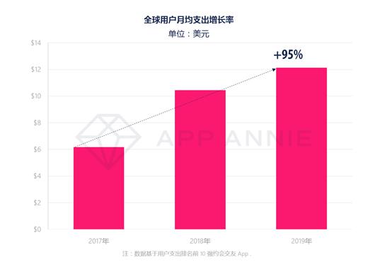 App Annie 數據顯示,自 2012 年起,全球 iOS 和 Google Play 上交友類 App 的下載量累計達到 17 億次。與此同時,在 2019 年,交友類 App 的全球用戶支出達到了 22 億美元,與 2 年前相比翻了一倍。同樣的增長情況也體現在單一用戶身上,相比于 2017 年,2019 年的全球月均用戶支出增長率高達 95%。