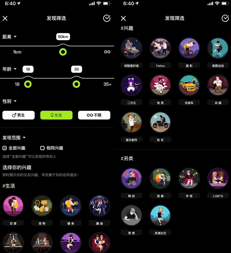 也有人更希望在遇到大海撈月般的少數同道人,積目就列出了 tattoo、蹦迪、改裝車、極限運動、冥想等標簽。此外,類似 Blued 這樣的同性社交也是約會 App 中不可或缺的類型。