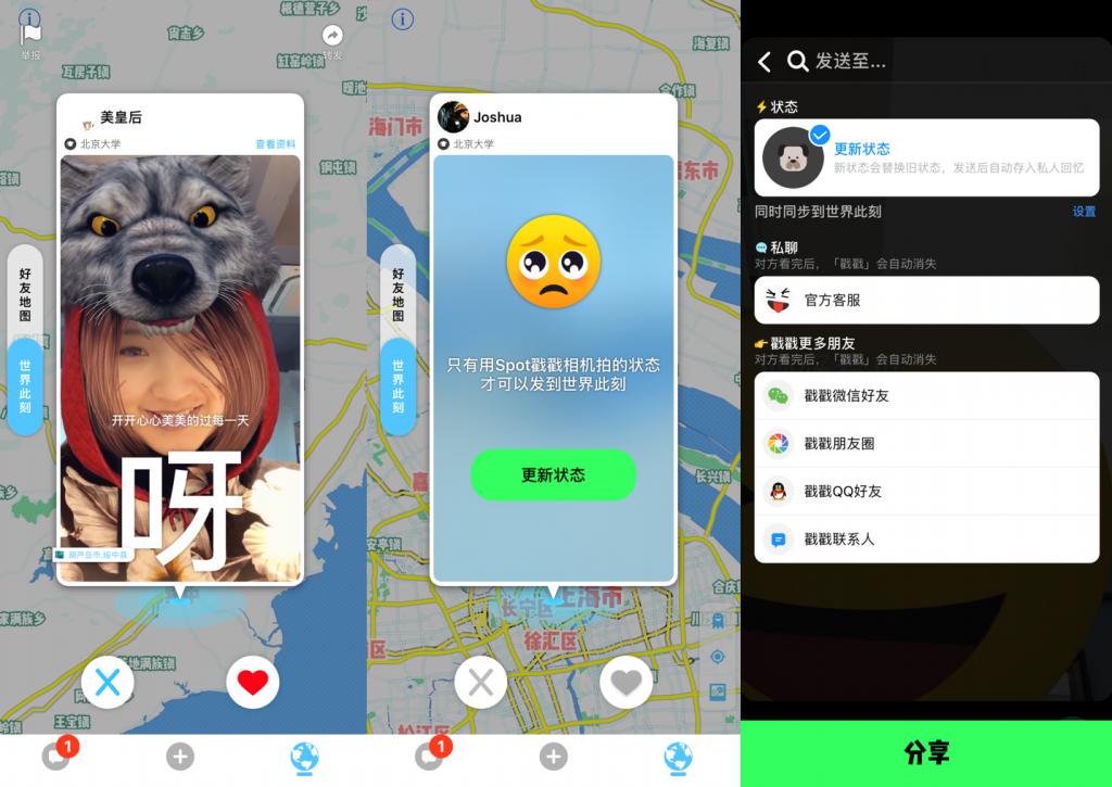 例如,有人更看重開啟一段感情的安全性。Spot 戳戳就鼓勵用戶接入通訊錄、微信、QQ 等平臺的關系鏈,并引入 Facebook、人人一樣的校友功能。用戶導入維度越豐富,系統就能沿著關系鏈做出更真實可靠的推薦。當然 Spot 戳戳的表情包、即刻分享等功能又保證了趣味性和簡單上手。