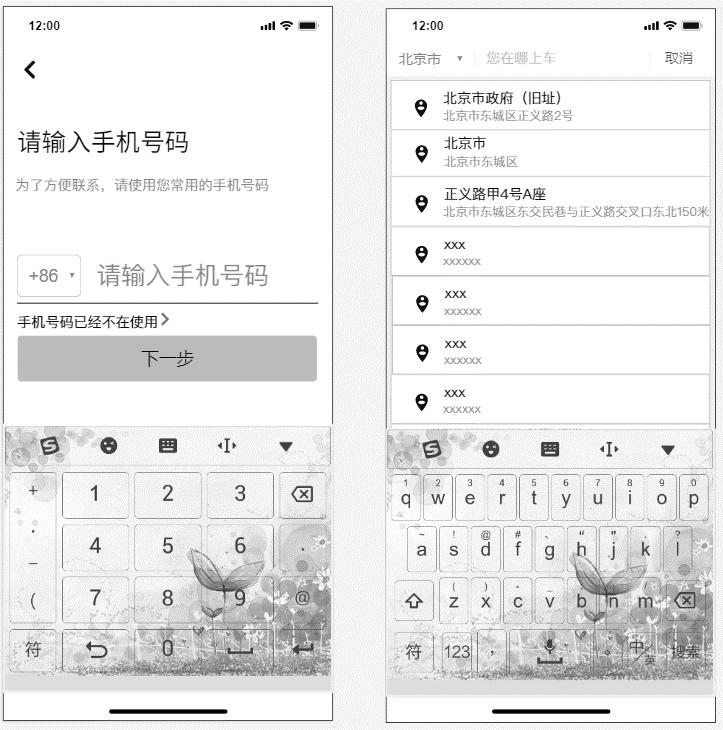 頁面入口:未登錄狀態下,用戶點擊輸入起點、輸入終點、消息、個人中心等界面入口時,自動跳轉入登錄界面
