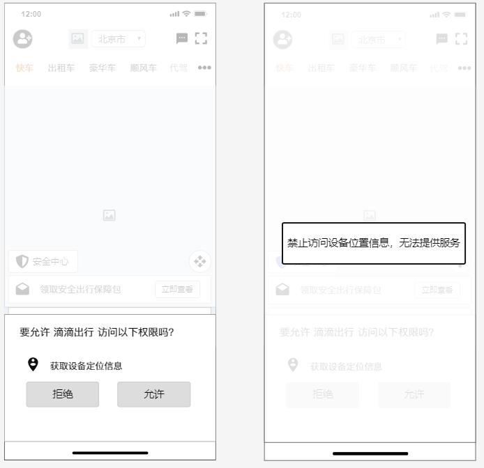 (2)若用戶點擊拒絕,則提示禁止訪問設備位置信息,滴滴出行無法提供服務。顯示時間為2s,然后直接跳轉至設置權限界面。