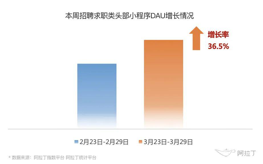 隨著疫情防控逐漸明朗,企業實際復工比例的逐步提高以及大量人才返回工作所在地,就業市場開始回溫,根據阿拉丁招聘求職類小程序 DAU 增長數據可看出,本周頭部該類小程序較上月同比有明顯的增長,增長率達到 36.5%。